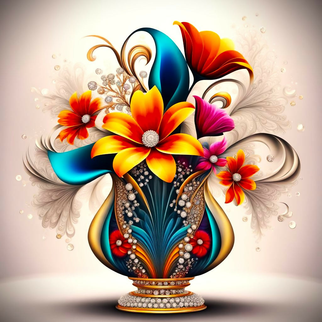 An opulent floral arrangement bursting from a decorative vase adorned with intricate gemstones and artistic patterns. The radiant hues and swirling ornamental details add depth and luxury, making this artwork a captivating centerpiece for refined interiors and collectors of exquisite floral compositions.