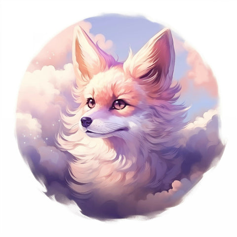 A soft, round fox with a cloud-like fur texture, its face glowing with gentle pastel hues. The eyes are large and filled with wonder. Behind it: a light, fluffy sky with wispy clouds swirling around.