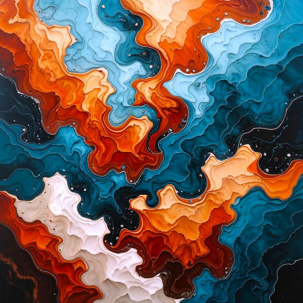 An abstract masterpiece featuring dynamic, swirling patterns in bold blue, orange, red, and white hues. The fluid interplay of colors and textures creates an immersive visual experience, reminiscent of geological formations and organic movement.