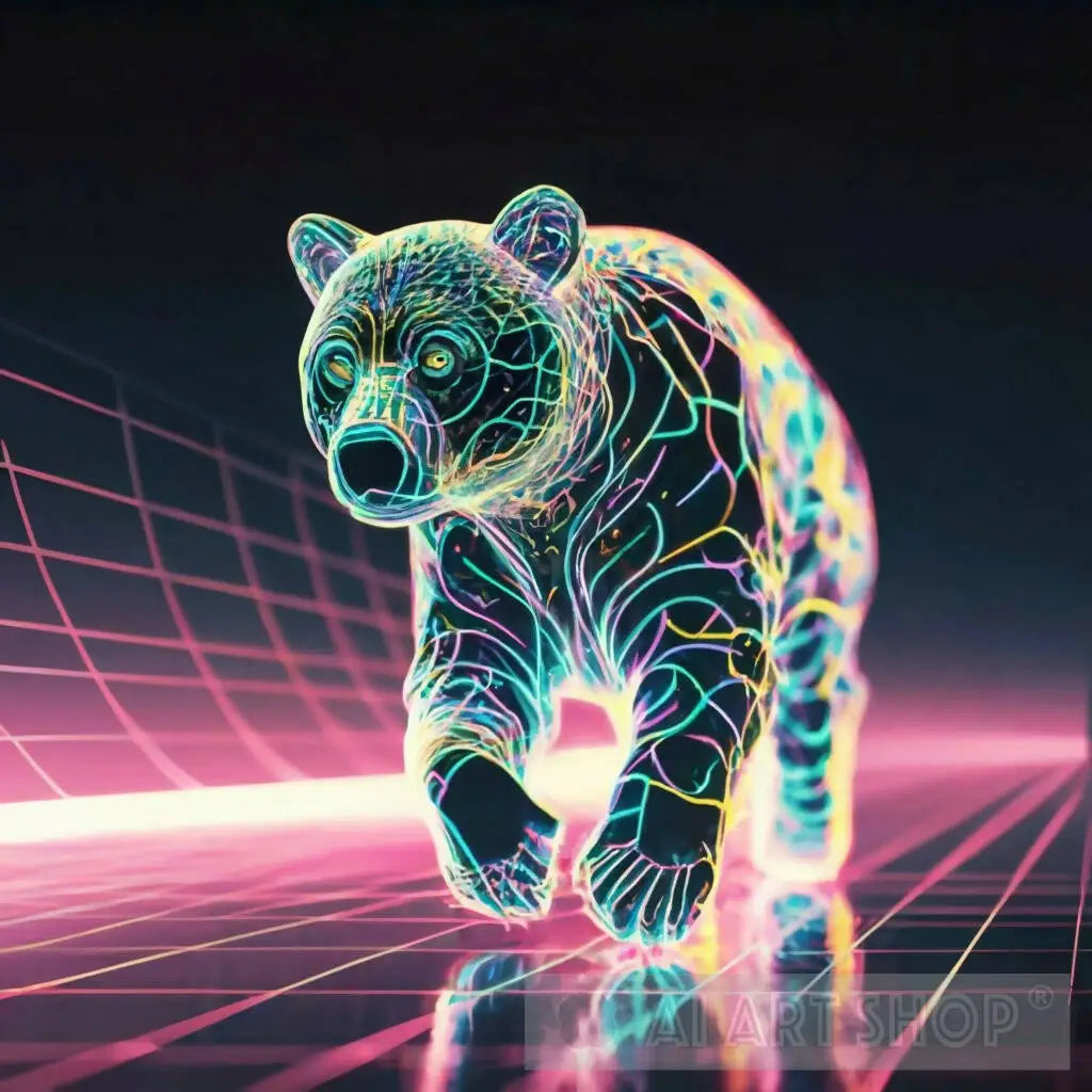 Fluorescent bear silhouette, neon rainbow, iridescent, wireframe, ethereal, linear, x-ray, vector. A cat runs sideways in a Tron-inspired scene. Artificial intelligence is used brilliantly. Shines with heavenly light. black background. Intense and deep colours. Unreal Engine 5 Wallpaper 8K Light 3D Conceptual Art Vibrant Dark Fantasy Architecture Anime Illustration 3D Rendering