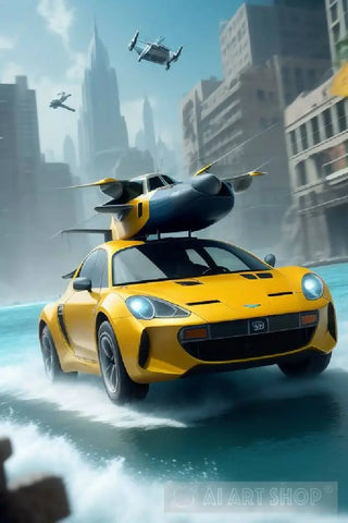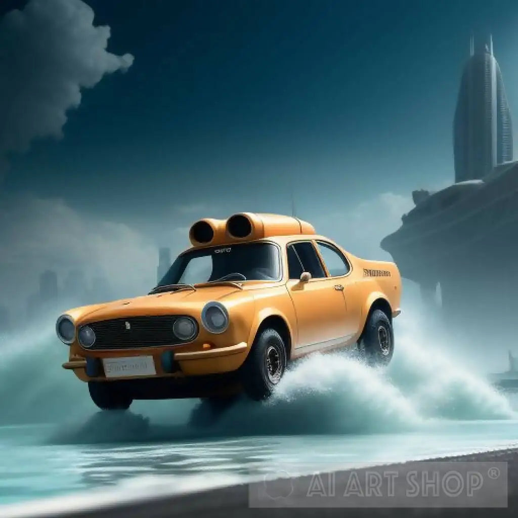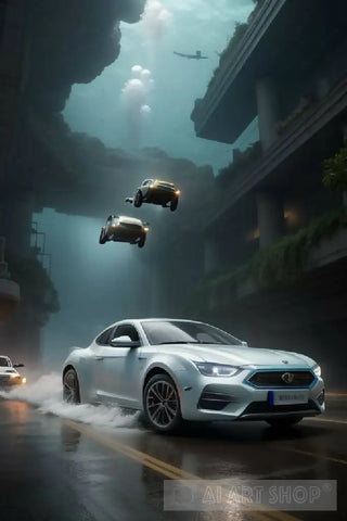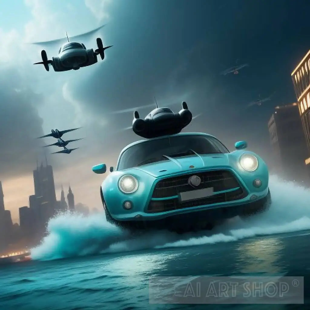 A flying car chase takes place in an underwater city, where the cars race at high speed, leaving a trail of scattered bubbles behind them. Glass buildings swiftly pass in every direction, and bright lights shimmer beneath the water's surface. Waves gently lap against the glass walls, adding to the atmosphere of excitement and thrill.