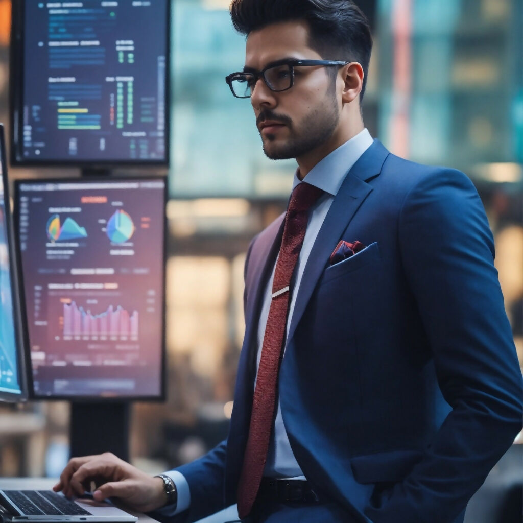 A sharply dressed young businessman in a tailored blue suit and red tie stands confidently in front of multiple financial data screens. His poised demeanor and modern office setting, highlighted by glowing charts and graphs, symbolize success, business intelligence, and leadership. Perfect for corporate decor, finance professionals, and modern office spaces.