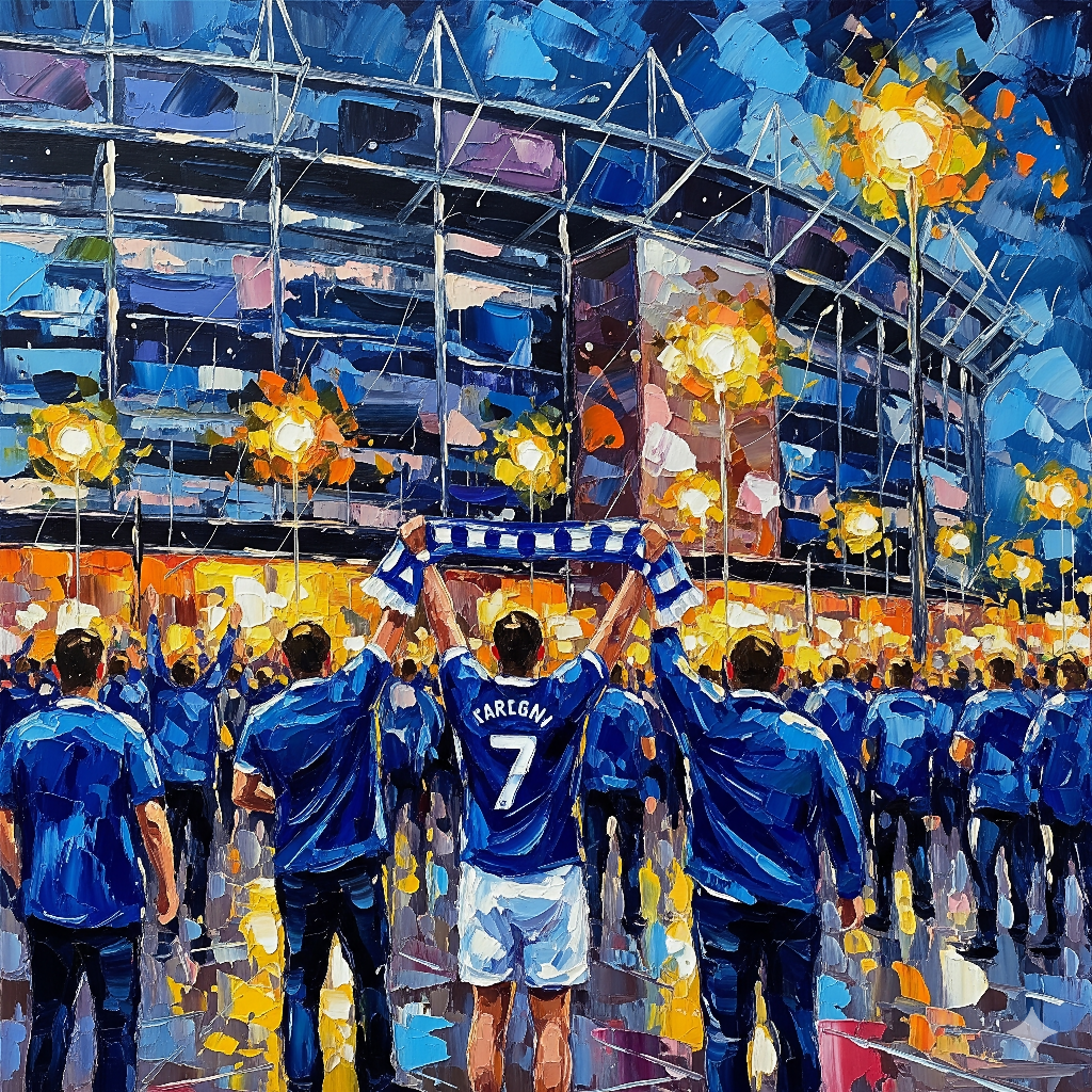 Lukisan digital bergaya impresionis yang menggambarkan suasana suporter sepak bola di depan stadion pada malam hari. Fans mengenakan jersey biru, mengangkat syal kebanggaan, dan berjalan bersama menuju stadion yang bercahaya. Karya ini menghadirkan energi, semangat, dan atmosfer pertandingan besar. Cocok untuk dekorasi ruangan, kafe, ruang kerja, atau koleksi pecinta seni dan sepak bola.