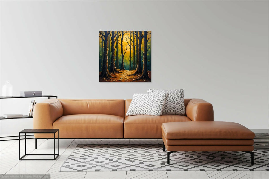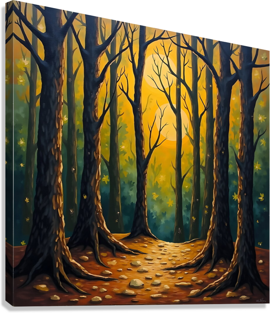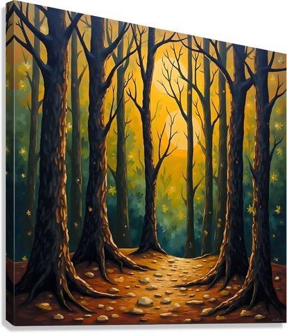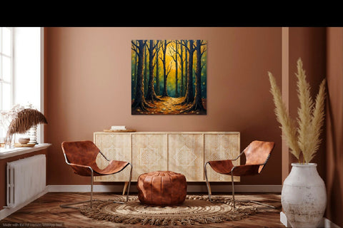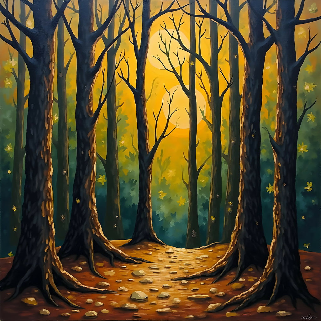 This image is a dynamic oil painting of a forest, characterized by bold geometric shapes and a textured, expressive aesthetic reminiscent of Cubist art.