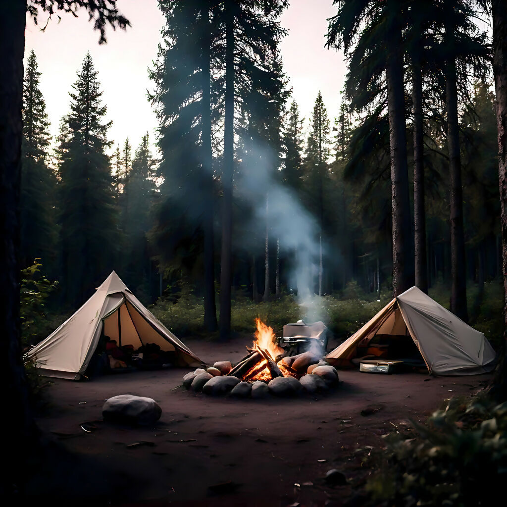 Step into the heart of wilderness with Forest Campfire Escape Under Pine Sky, a tranquil landscape AI artwork that captures the soul of outdoor adventure. Nestled deep within a pine forest, two canvas tents flank a glowing campfire, where smoke curls into the crisp air and a pot simmers with warmth. This scene evokes the quiet magic of early morning or twilight—moments when nature whispers and stories unfold. Inspired by the timeless allure of forest retreats, this piece invites viewers to reconnect with simplicity, solitude, and the primal comfort of firelight beneath towering trees.