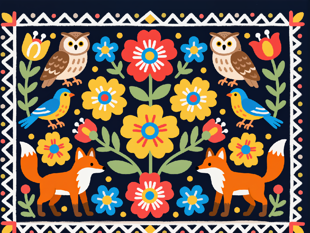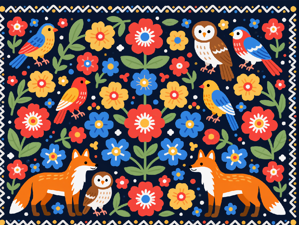Foxes, owls, birds, and bold florals burst in primary colors on deep navy, arranged in symmetrical folk-art style with charming rustic geometry.