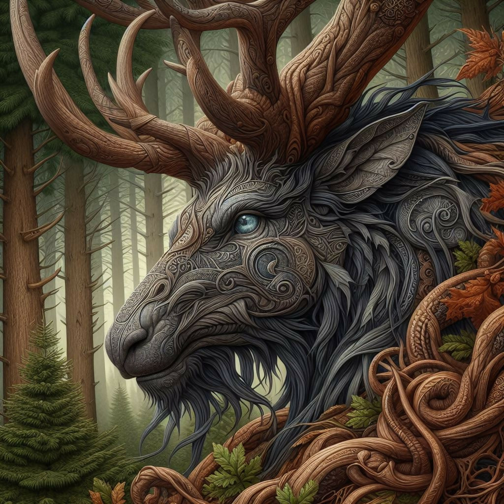 Tags: stag, ornate antlers, forest spirit, mythical creature, fantasy animal, blue eye, woodland guardian, nature symbolism, surreal illustration, tribal carvings.