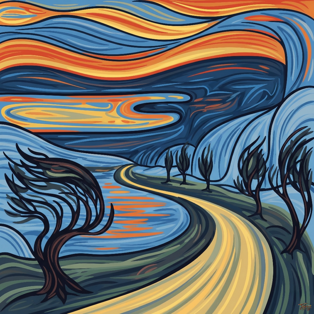 "Forest Road," is a striking example of digital art that evokes a strong emotional response through its bold use of color and expressive, flowing lines. A digital paint style, characterized by clean, sharp edges and a dynamic, almost sculpted quality. I  used a palette of cool blues and warm oranges to create a powerful contrast, suggesting a vibrant sunset or an otherworldly glow against a somber landscape. The swirling shapes of the sky and the road guide the viewer's eye through the piece, creating a sense of movement and energy, just follow the road ...