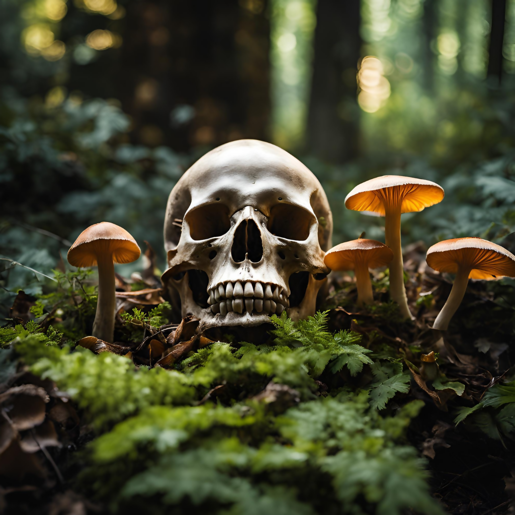 Skull in the forest with wild mushrooms