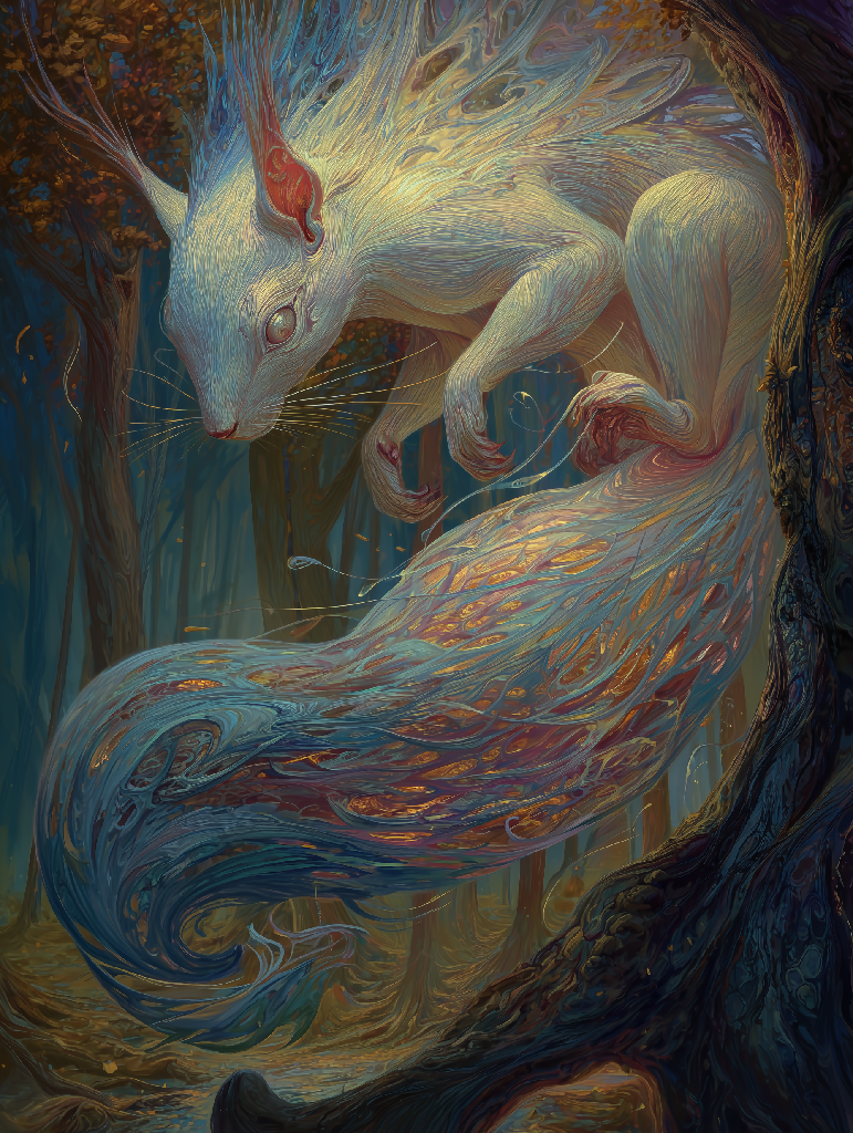 A Beautiful translucent squirrel spirit watches over the tranquil dark forest.