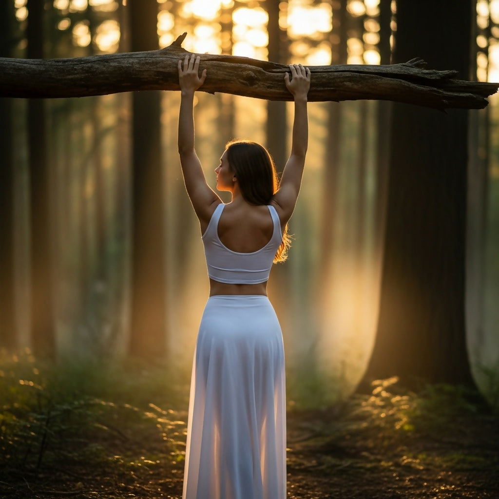 A woman in white clothing holds onto a fallen tree branch, backlit by warm golden hour sunlight filtering through the trees in a serene forest.