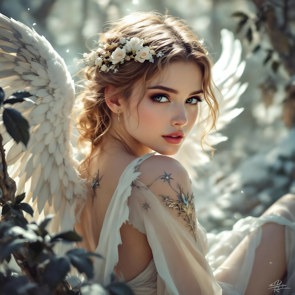 “Forest Whisper” presents a gentle, luminous angel caught in a tender moment of reflection. Her soft expression, accented by star-kissed tattoos and a floral crown of ivory roses, invites quiet intimacy and wonder. Wings of soft ivory and a delicate gown complete the vision, surrounded by the dappled light of an enchanted forest.