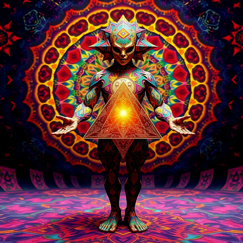 Step into a realm of cosmic consciousness with Fractal Divinity, a mesmerizing fusion of psychedelic, visionary, and spiritual art. This piece features an enigmatic celestial being adorned in intricate, kaleidoscopic patterns, radiating a sense of higher wisdom and divine energy. A glowing sacred pyramid hovers at its core, symbolizing enlightenment, transformation, and the infinite mysteries of the universe.
