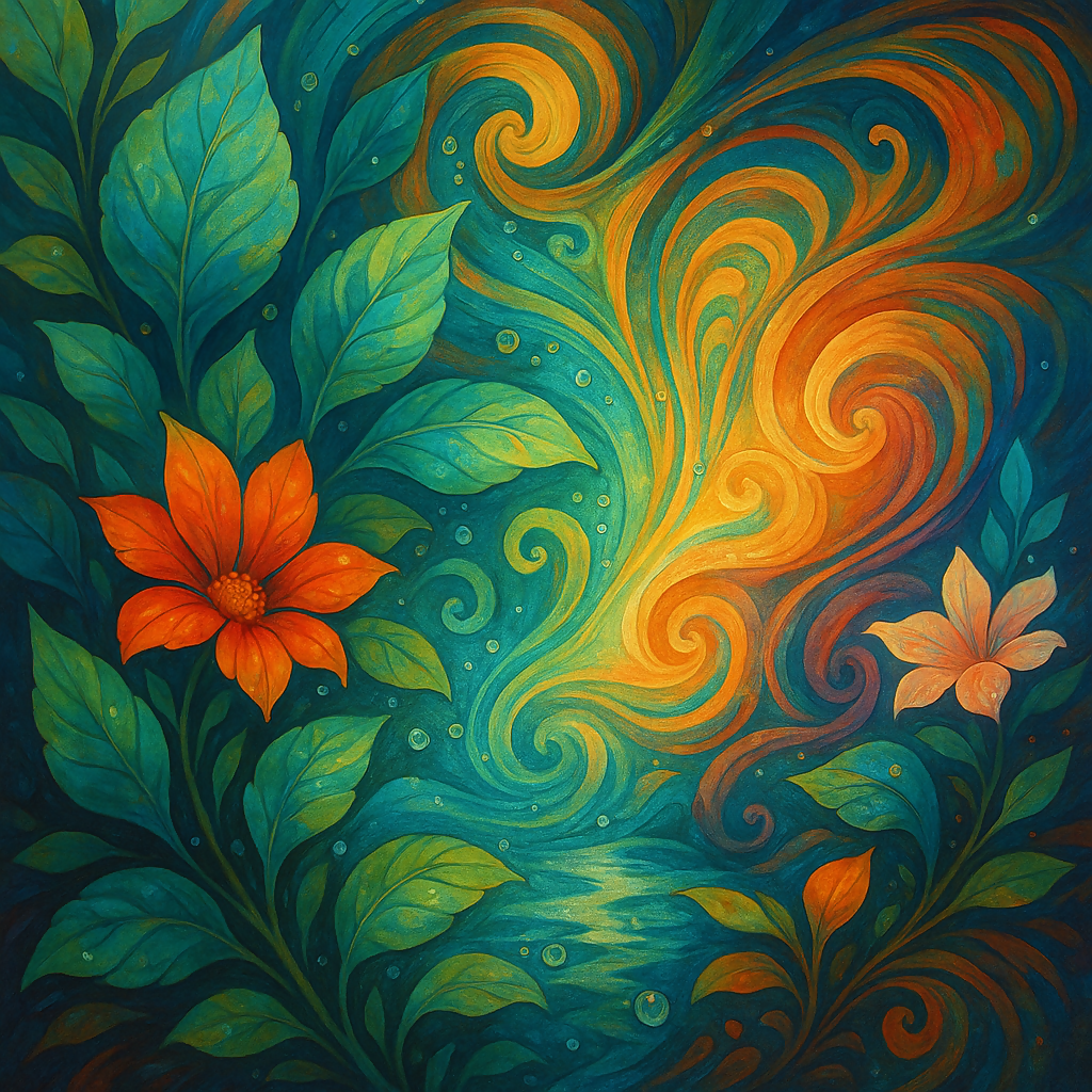 This abstract digital artwork features swirling fractals with vibrant colors reminiscent of nature and organic forms.
