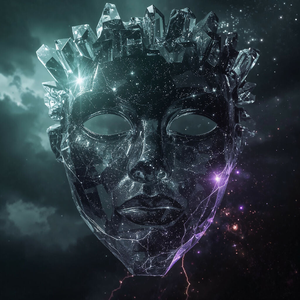 A crystalline visage emerges from cosmic darkness, its surface fragmented like broken glass yet maintaining serene composure. The face appears carved from compressed starlight and shadow, crowned with geometric crystal formations that catch purple fire. Each crack suggests both vulnerability and the sacred act of breaking open to reveal inner luminescence. The composition presents divinity as both fragile and eternal, beauty that survives shattering through its very acceptance of impermanence. This is the face of wisdom acquired through dissolution, where spiritual authority comes not from perfection but from the courage to remain whole while embracing brokenness.