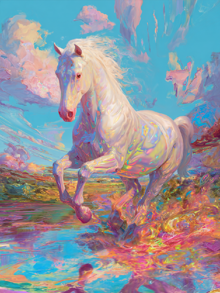 A stunning AI image of a white horse crashing through a wetland refracting light.