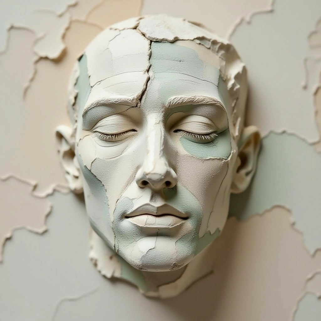This evocative sculpture features a serene human face crafted from layered, cracked plaster, blending soft pastel tones of white and mint green. The closed eyes and gentle expression convey a sense of calm, while the fragmented surface adds a modern, textured depth. Ideal for adding a minimalist yet striking piece to any art collection or interior space.