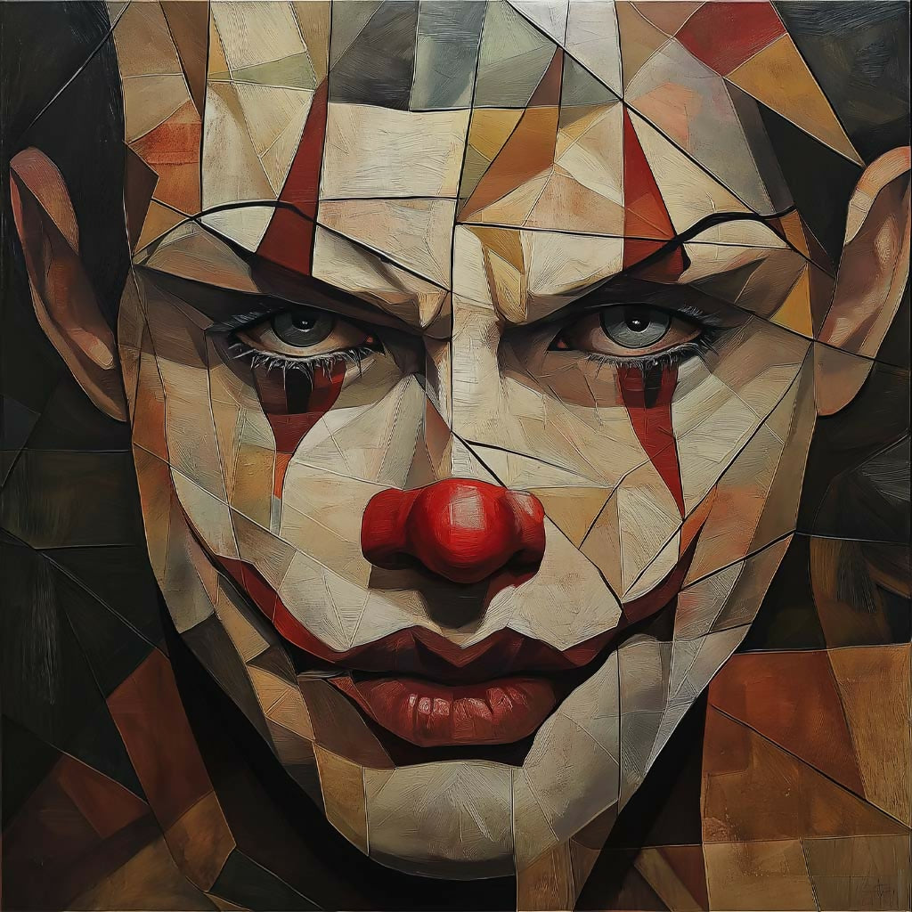 Step into the surreal and unsettling world of Fragmented Laughter, an AI-generated cubist masterpiece that reimagines the traditional clown as a kaleidoscopic enigma. This grotesque artwork features a distorted clown figure fractured into bold geometric shards, each piece bursting with vivid, chaotic colors.