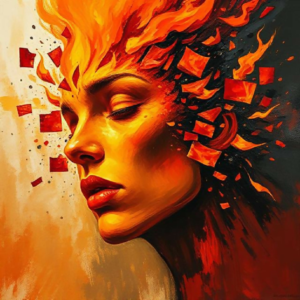 An intense abstract portrait where a face dissolves into fiery shards, each piece alive with flames. Painted in bold strokes of orange, red, and black, the work symbolizes chaos, passion, destruction, and the possibility of rebirth.