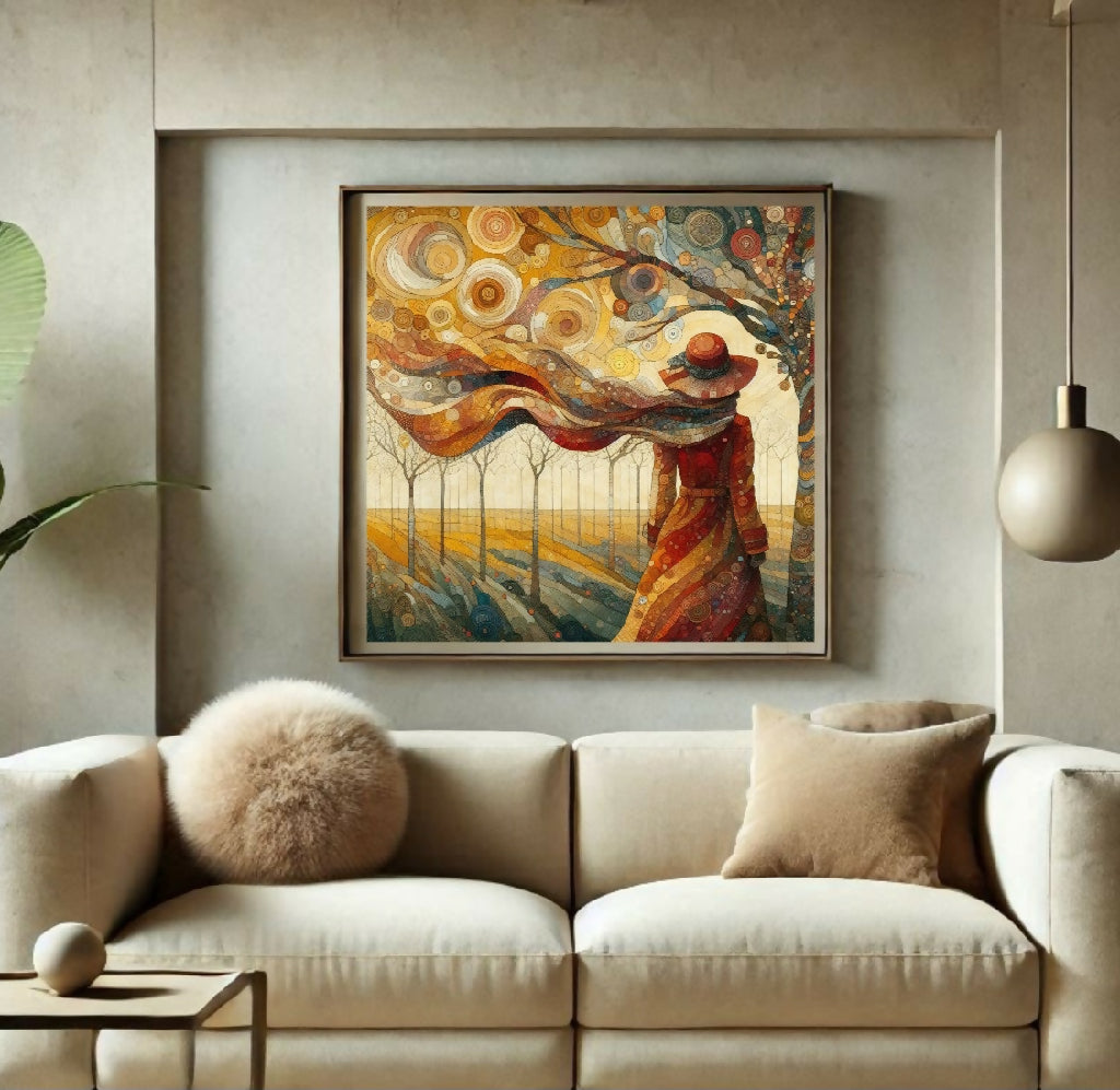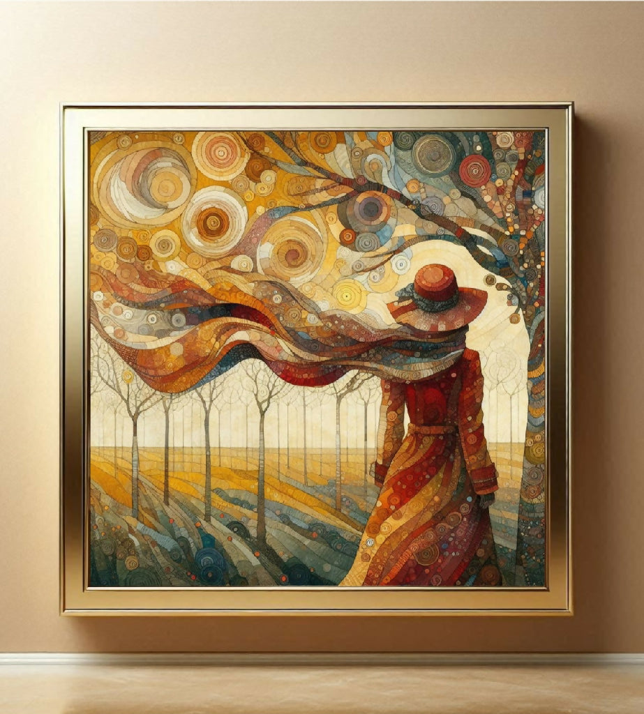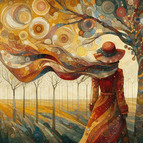 Eine Frau in einem langen, roten Mantel und einer passenden Hütte, die mit dem Rücken zum Betrachter steht und in einer Landschaft mit Bäumen und einem Himmel voller kreisförmiger, bunter Muster steht. Ihr Schal weht im Wind. Die Farben des Gemäldes sind hauptsächlich Erdtöne, mit verschiedenen Schattierungen von Rot, Gelb und Braun. Die allgemeine Stimmung des Gemäldes ist ruhig und nachdenklich.