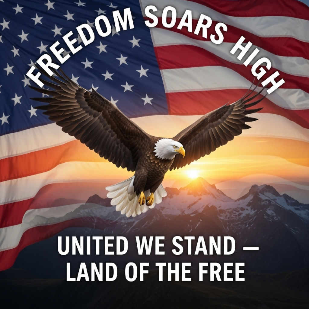 Show your love for America with this bold patriotic design featuring the U.S. flag and the iconic bald eagle. The powerful slogan “Freedom Soars High — United We Stand, Land of the Free” captures the spirit of unity, liberty, and national pride. Perfect for stickers, posters, t-shirts, or digital use, this artwork symbolizes strength, freedom, and the American dream.