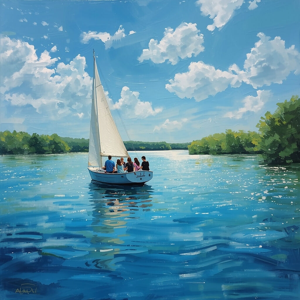 A joyful group of friends sailing together on a small sailboat gliding along a sparkling river. The water surface dances with vibrant reflections of a brilliant blue sky and scattered white clouds, broken into shimmering patches of turquoise, cobalt, and silver by the boat’s gentle wake. The friends are casually posed some laughing, one pointing ahead, another leaning on the rail their clothing in fresh, summery tones of yellow, red, and white catching the sunlight. The entire scene is painted with bright, pure colors applied in short, thick, lively brushstrokes reminiscent of Impressionist spontaneity: crisp cerulean blues, sunny yellows, crisp whites, and warm skin tones rendered with energetic dabs and dashes that make the water, sky, and figures feel alive and full of movement.