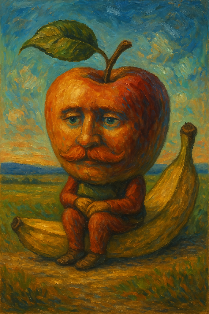 “Fruit of Thought” is a bold and whimsical surrealist painting depicting a faceless man with an apple for a head, seated pensively on a giant ripe banana. Set against a minimal yet dreamlike background, the scene blurs the line between absurdity and introspection, inviting viewers to question identity, purpose, and the strange beauty of imagination.
