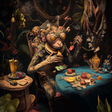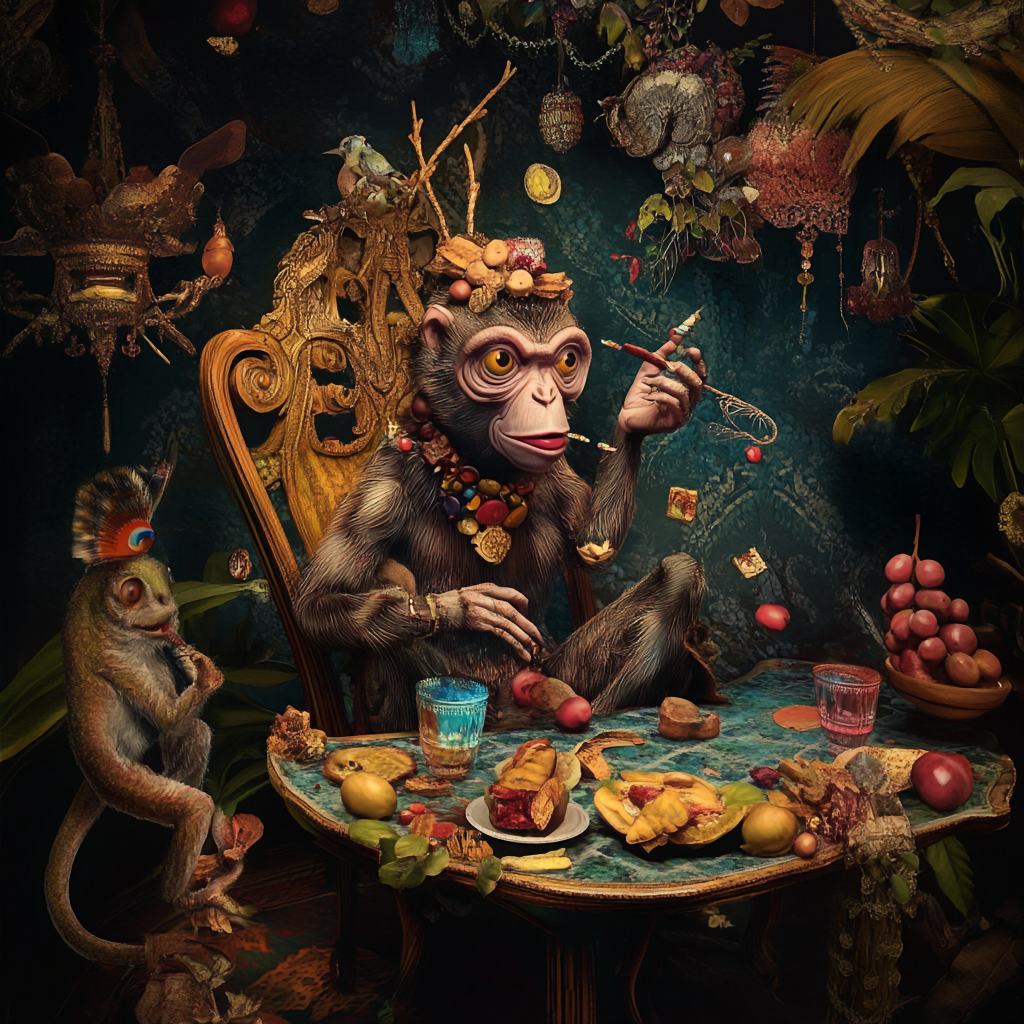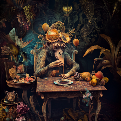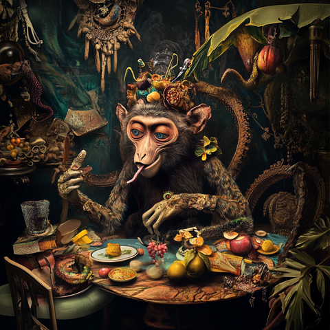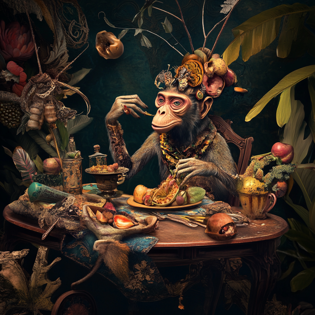Enter the banquet of bearded brilliance — five whimsical apes in a surreal feast of fruit, thoughts, and jungle secrets. This AI-generated art set blends Renaissance ambiance with tropical chaos in a way that’s both clever and absurd.