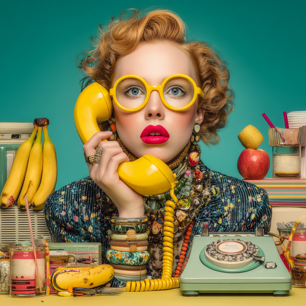 Tags: yellow rotary phone, teal background, vintage radio, fruit still life, eclectic fashion, kitchen props, retro aesthetic