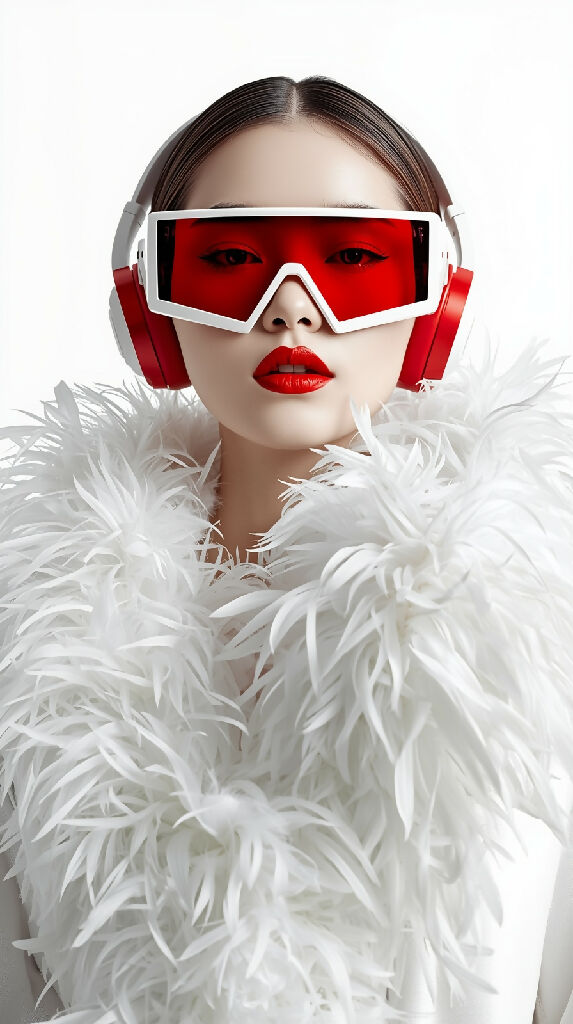 Full-body digital clipart of a stylish Korean female model, shown from head to toe, with porcelain-pale skin and vivid red lips. She wears sleek white angular goggles with vibrant red lenses and matching red headphones, partially hidden by a voluminous white feather boa framing her face. The entire figure stands elegantly against a seamless pure-white background. Soft, diffused lighting highlights her delicate skin and the fluffy feather textures, emphasizing her intense gaze and the sharp geometric lines of the eyewear. A bold red-and-white monochrome palette conveys a futuristic, fashion-forward mood with cinematic sophistication. High-resolution, finely detailed textures, centered full-body composition — perfect for modern editorial clipart.