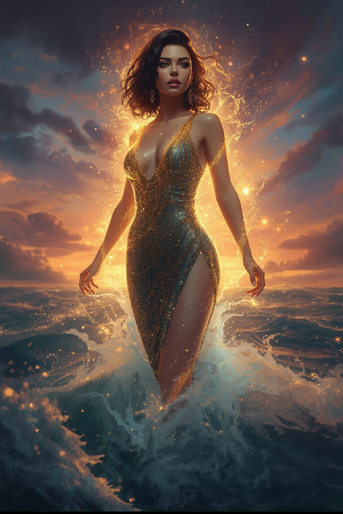 Full-body shot of a powerful goddess emerging reborn from the ocean at sunset