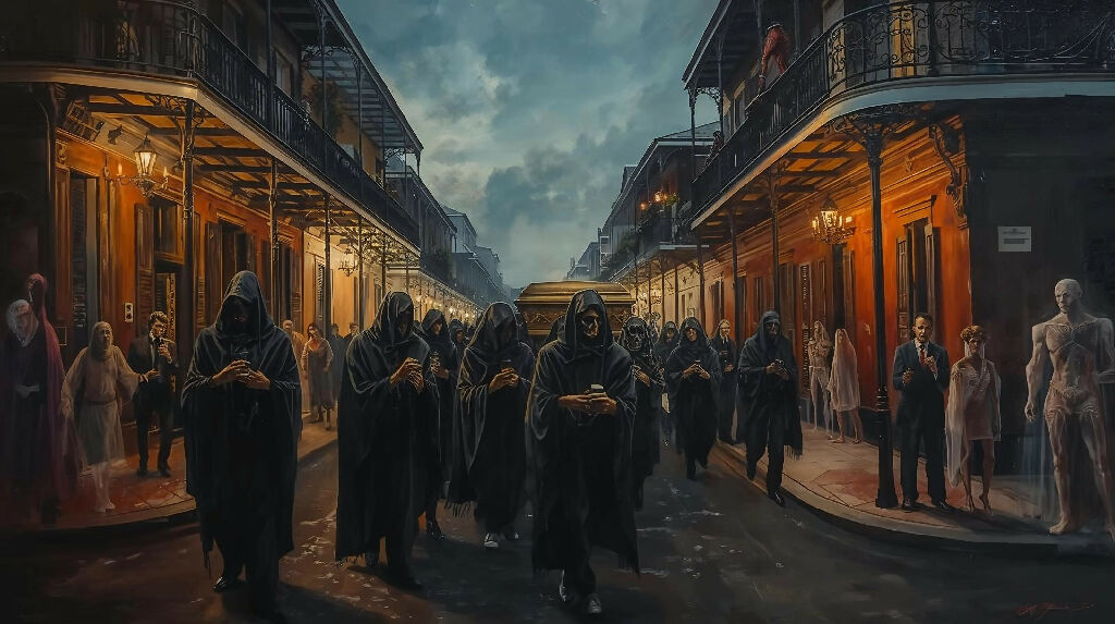 Creepy painting of hooded figures carrying a coffin in a funeral procession on Bourbon Street with onlookers dressed in costumes.