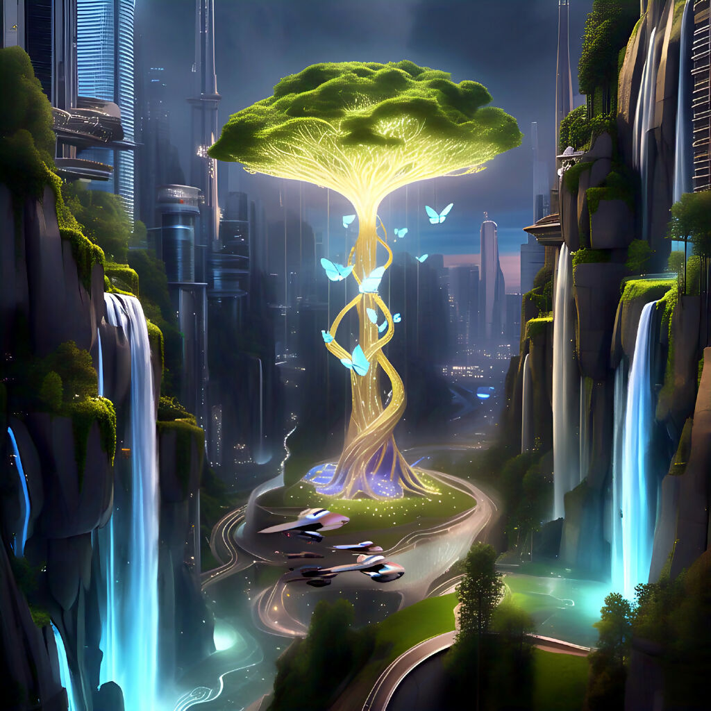 FuturCascade: Visionary Waterfall Cityscape is a captivating AI-generated artwork where nature’s majesty meets urban imagination. It features dramatic cliffs pouring into cascading waterfalls, seamlessly blending with towering, futuristic architecture. The skyline is adorned with a glowing, biomechanical tree—symbolizing harmony between ecology and innovation.