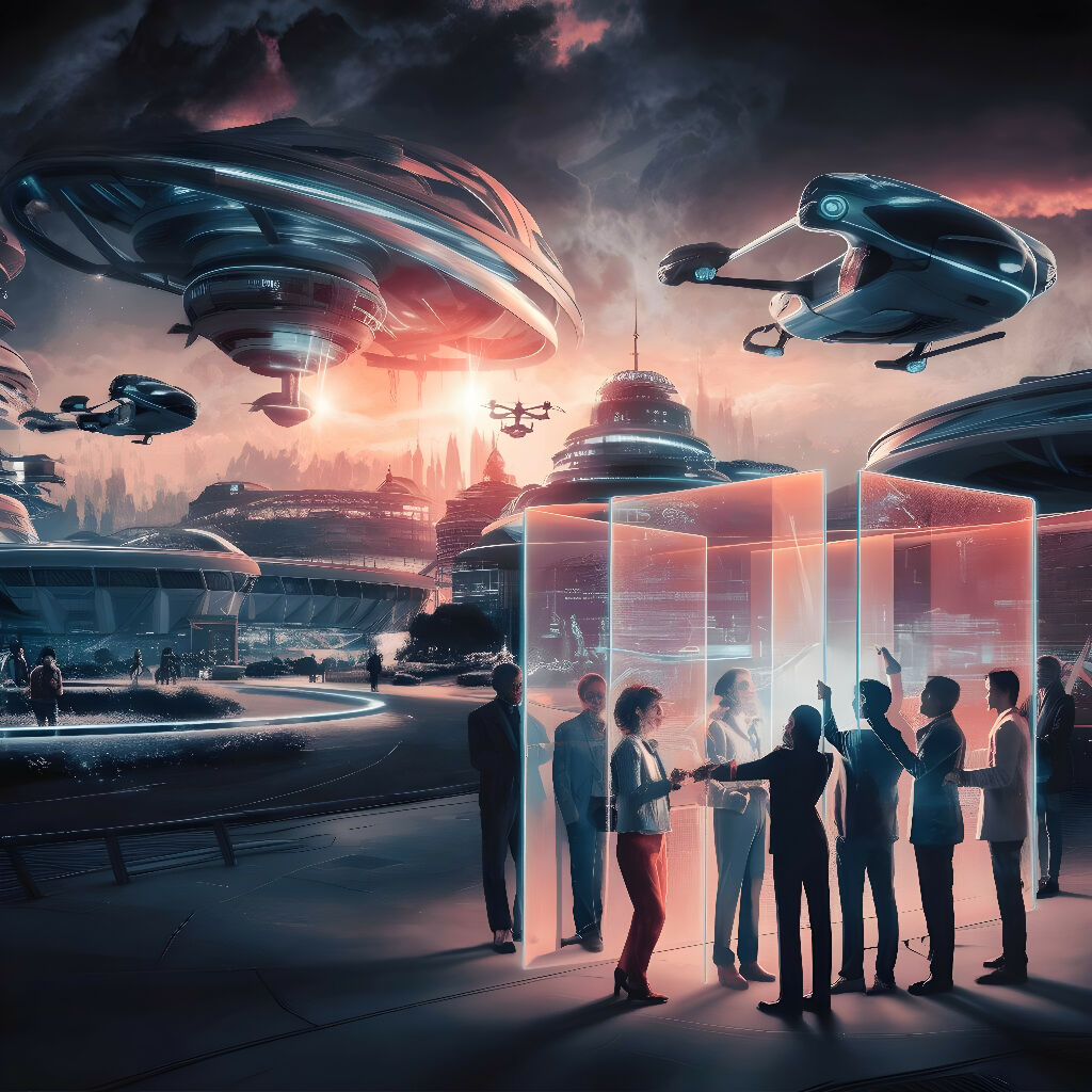 Step into a mesmerizing vision of the future! This stunning digital artwork showcases a bustling futuristic cityscape where advanced technology and human interaction blend seamlessly. Floating vehicles and massive structures dominate the sky, while a group of diverse individuals gather around a glowing holographic display in the foreground. The image captures a perfect balance of awe-inspiring tech and human connection, all bathed in a dramatic, colorful atmosphere that hints at both progress and challenges ahead.