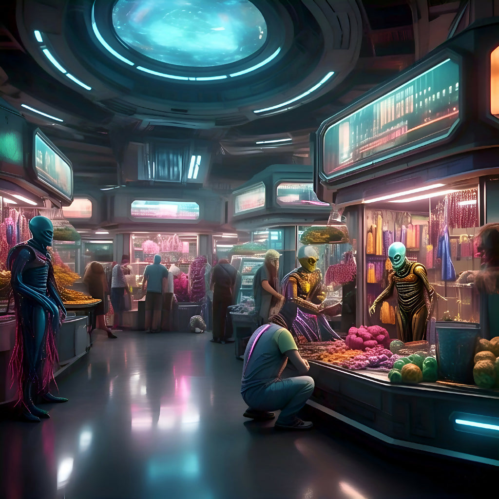 Step into a mesmerizing world with this stunning AI-generated artwork titled "Futuristic Alien Market." This piece captures an otherworldly marketplace bustling with life, where humanoid aliens and humans interact among glowing stalls brimming with exotic goods. The scene unfolds beneath a vast, dome-like ceiling that opens to a cosmic sky, immersing the viewer in a dreamlike, interstellar ambiance.