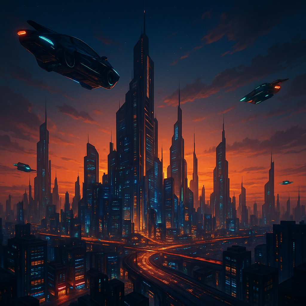 This digital artwork showcases a futuristic city skyline at sunset, with flying cars, neon lights, and towering skyscrapers. It captures a vibrant sci-fi atmosphere.