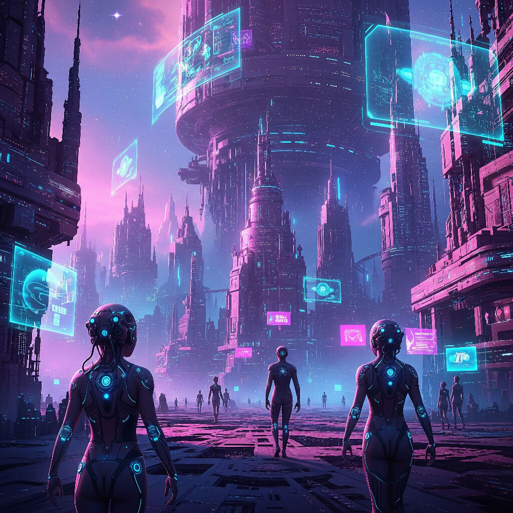 The image showcases a stunning futuristic cityscape with towering skyscrapers adorned with glowing neon lights. The sky blends vibrant shades of pink and purple, giving the scene a surreal, cyberpunk aesthetic. Floating holographic screens display various data, adding to the high-tech atmosphere. The streets are lined with sleek, grid-like patterns, while humanoid figures dressed in advanced suits with illuminated details walk toward the center of the city. This depiction paints a compelling vision of a technologically integrated future, where digital advancements shape everyday urban life.
