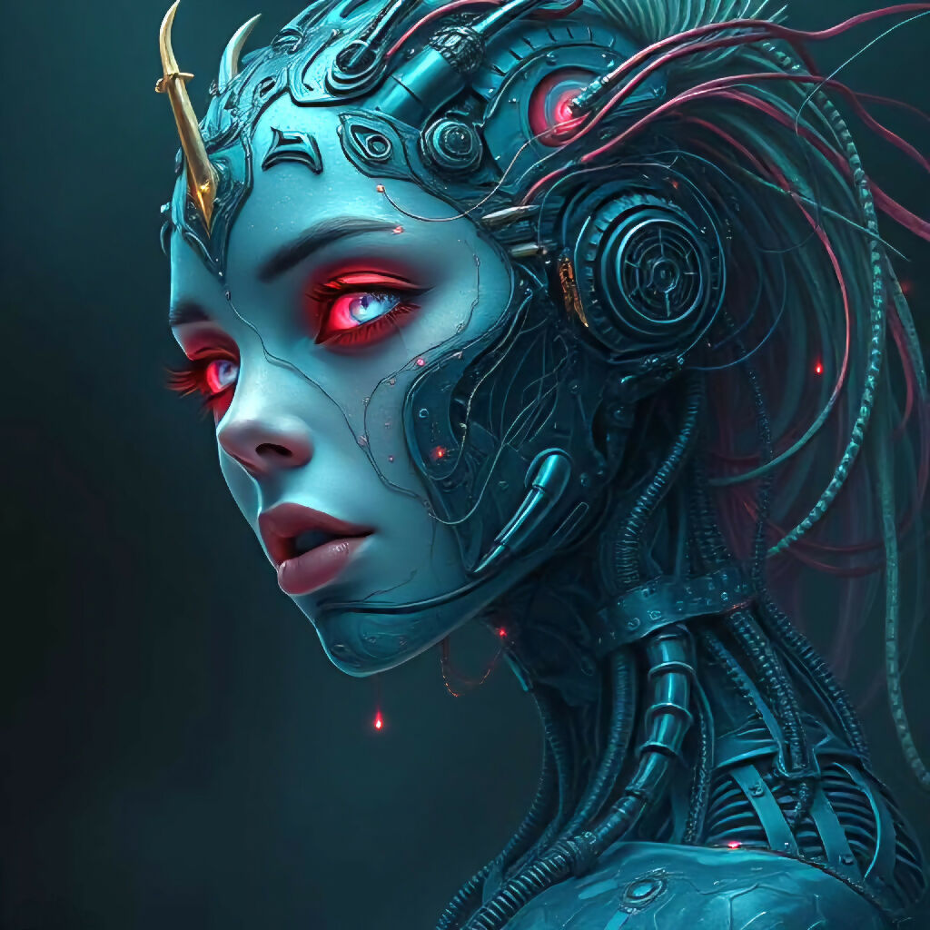 "Futuristic Cyborg Lady" is a captivating blend of beauty and technology, brought to life in stunning photorealism. This mesmerizing female cyborg exudes a bold, otherworldly presence, with glowing red and blue eyes that seem to pierce through time.  Every detail of her sleek design and powerful gaze pulls you into a future where humanity and technology intertwine in a stunning display of strength and allure.