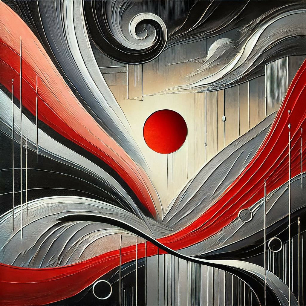 An impressive abstract painting that comes in an elegant silver red and black design. The combination of these two colors creates a powerful yet luxurious atmosphere.