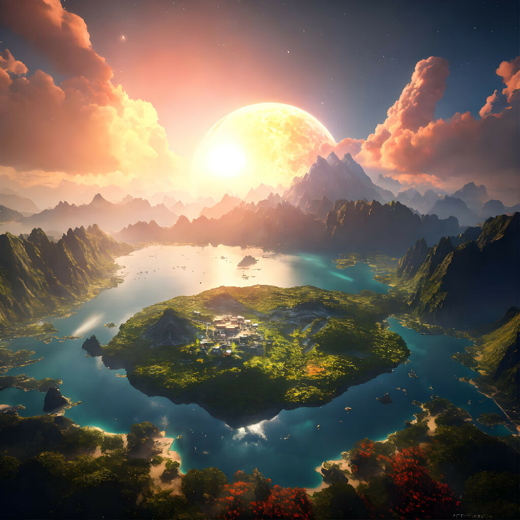 island with one planet in background, being reincarnated into a new world, sky nebula, sci-fi 3D scene of a showing mountains , , maximalism, ambient occlusion, volumetric light, sun beam, atmospheric haze, unreal engine, hyper realism, realistic shading, cinematic composition, realistic render, octane render, detailed textures, photorealistic, wide shot.