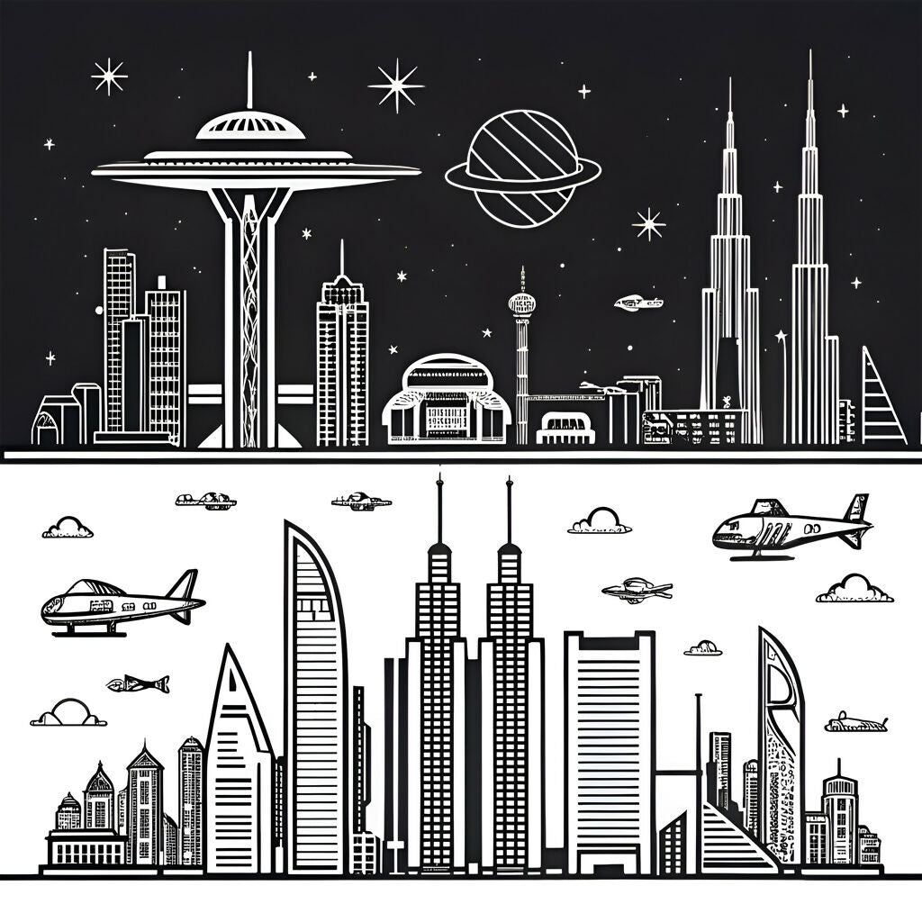 Transform your space with Futuristic Skyline AI Art, a breathtaking AI-generated digital masterpiece showcasing two stunning cityscapes. The upper section presents a mesmerizing futuristic skyline illuminated by celestial elements, including stars and planets, while the lower half contrasts with a vibrant, modern daytime cityscape featuring iconic skyscrapers and soaring aircraft. A seamless blend of architectural brilliance and cosmic wonder, this digital artwork captures the essence of an advanced urban future. Perfect for sci-fi lovers, tech enthusiasts, and collectors of digital artwork.