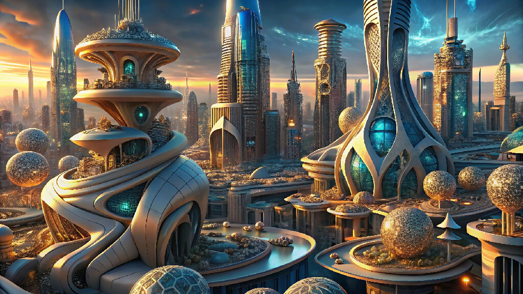 Step into the future with this mesmerizing AI-generated artwork of a futuristic cityscape. Featuring imaginative architecture, soaring skyscrapers, and intricate details, this piece captures the essence of innovation and urban fantasy. Warm sunset lighting and unique building designs make it a perfect statement piece for modern homes, offices, or anyone passionate about futuristic design and sci-fi aesthetics.