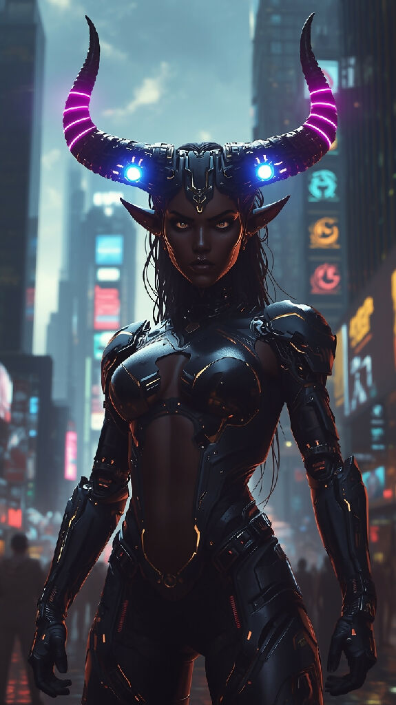 Futuristic Taurus woman with defined facial features and dark skin, wearing intricately designed cybernetic armor that accentuates her athletic build, her horns glowing with vibrant neon circuits that pulse with a blue and purple light, standing assertively in the midst of a bustling techno city with sleek skyscrapers and holographic advertisements, the atmosphere is dense with a cinematic sci-fi realism that blends gritty textures with luminous neon accents, the woman's eyes gleam with a fierce inner light as she gazes out upon the cityscape.