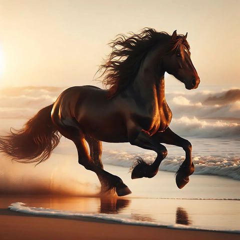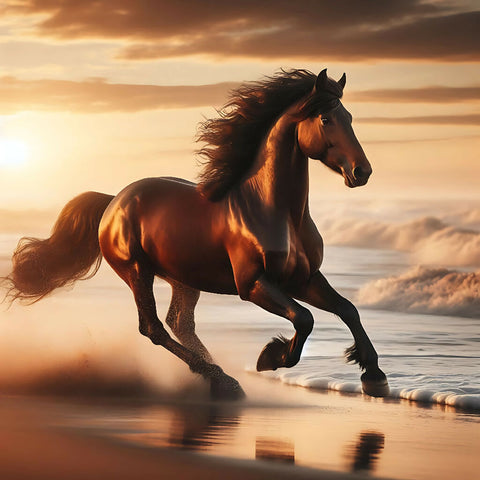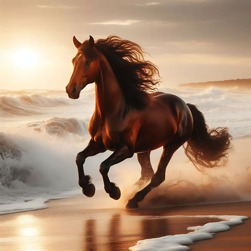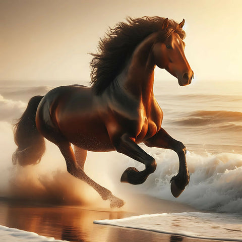 A brown horse, mid-gallop, runs along a beach at sunrise or sunset.  The horse is positioned near the center of the image, moving toward the right side of the frame.  Its coat is a rich, dark brown, and its mane and tail are flowing freely, caught in the wind.  The horse appears strong and powerful, with visible muscles and a well-defined form.  Large, foamy waves crash around its legs, and the water reflects the golden light of the rising or setting sun. The water is a mixture of dark blue and golden hues. The background displays a vast, cloud-filled sky, with a large, luminous golden moon prominent.  A smaller, golden sun is visible near the upper right corner. The colors are rich and vibrant, with warm tones dominating the scene.  The style is photorealistic, but with a painterly quality, enhanced by the reflections in the water and the dramatic lighting. The overall atmosphere is one of freedom, power, and beauty, evoking a sense of wildness and the majesty of nature.  The perspective is slightly angled down towards the horse, focusing on the horse's dynamic movement and the interaction with the water and surroundings.