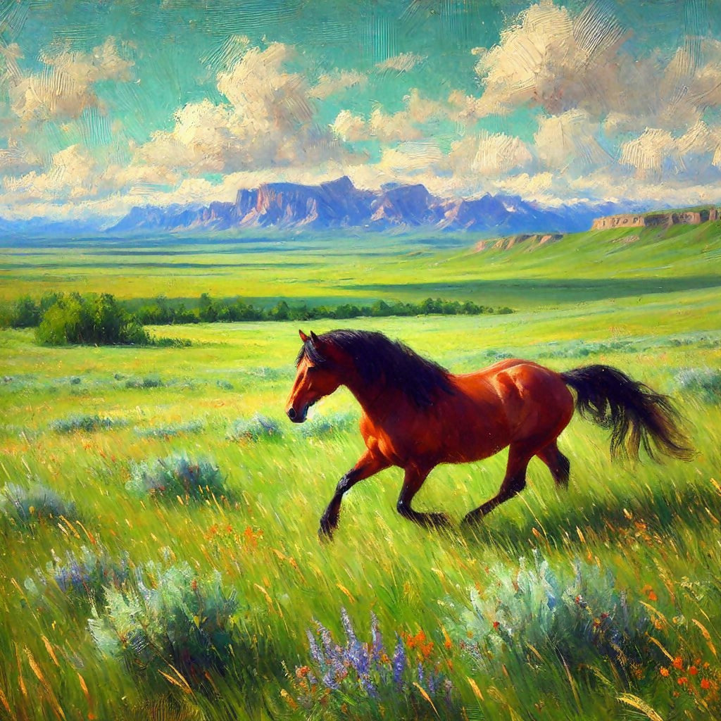This painting is a high-level work of art that successfully blends elements of dynamism and tranquility, realism and abstraction. Through the interplay of the galloping horse and the grassland, it masterfully conveys the beauty and power of nature. The piece holds immense visual appeal and emotional resonance.