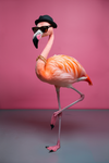 The image features a Gangsta flamingo standing on one leg against a pink background. The flamingo is considered to be a timid and quite creature, however the inside of it might be something different. The overall scene is playful and whimsical, combining the natural elegance of the flamingo with Shrewd mind.