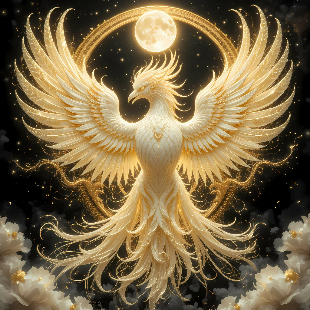 An elegant ikigai style with bright lite liquid gold, black bold, and bronze colors texture, themes " giant white Garuda bird mythical creature under moon light shadow ". The feathers texture is bright white golden colors featuring luminus crystaline ethereal light body".