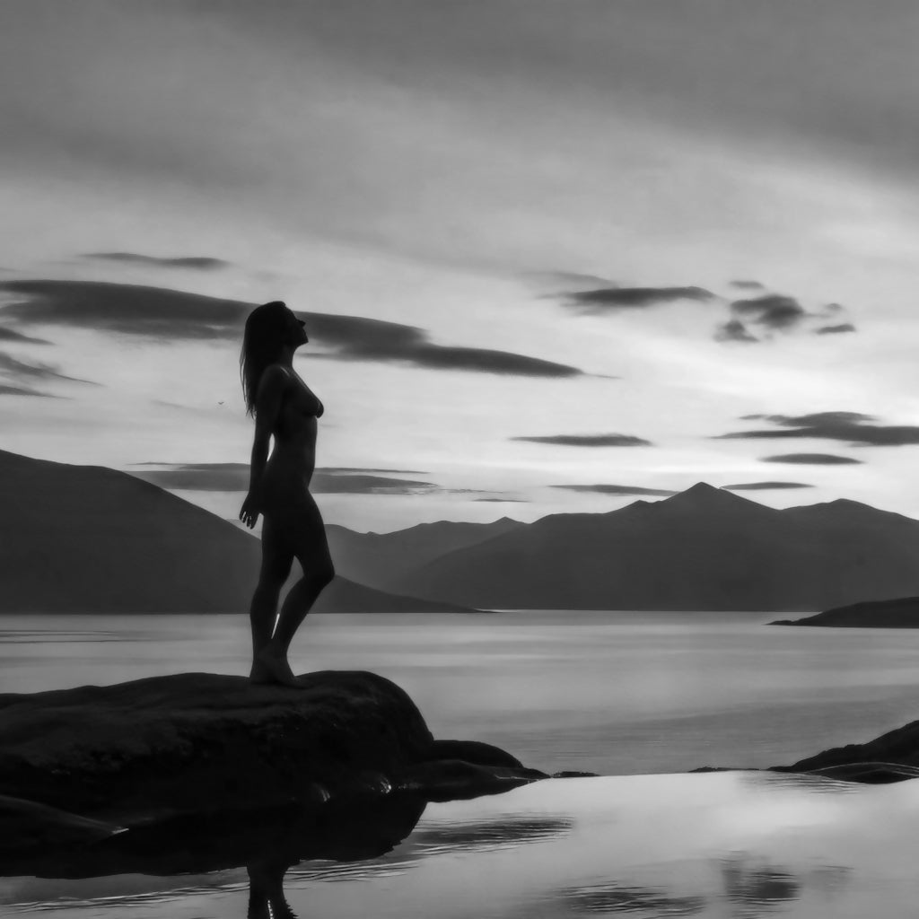 triking black and white profile portrait of a woman standing on a rock, admiring a vast, serene lake and majestic mountain landscape.