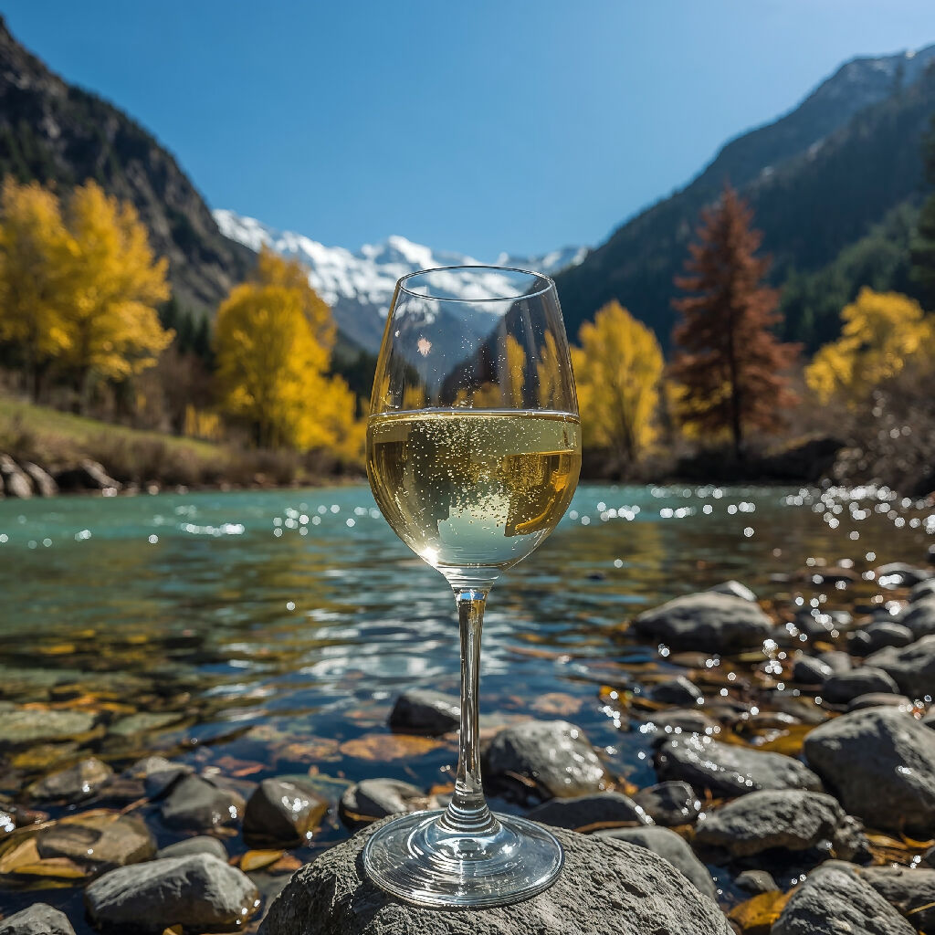 generate image: in the foreground is an elegant wine goblet made of transparent glass on a thin stem, the goblet is filled with light-light yellow wine with bubbles. the goblet stands on rounded stones on the bank of a mountain river, the river is green-blue, transparent. in the background are mountains covered with snow. autumn is all around, trees with bright yellow foliage, there are trees with red foliage. Camry is strewn with fallen yellow leaves. the sky is bright blue, clear. the colors are saturated, bright.