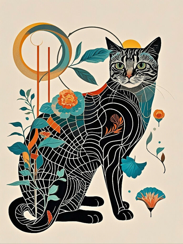 A mystical tabby cat wrapped in luminous white linework, surrounded by vibrant leaves and golden rings. This piece symbolizes growth, balance, and connection with nature.